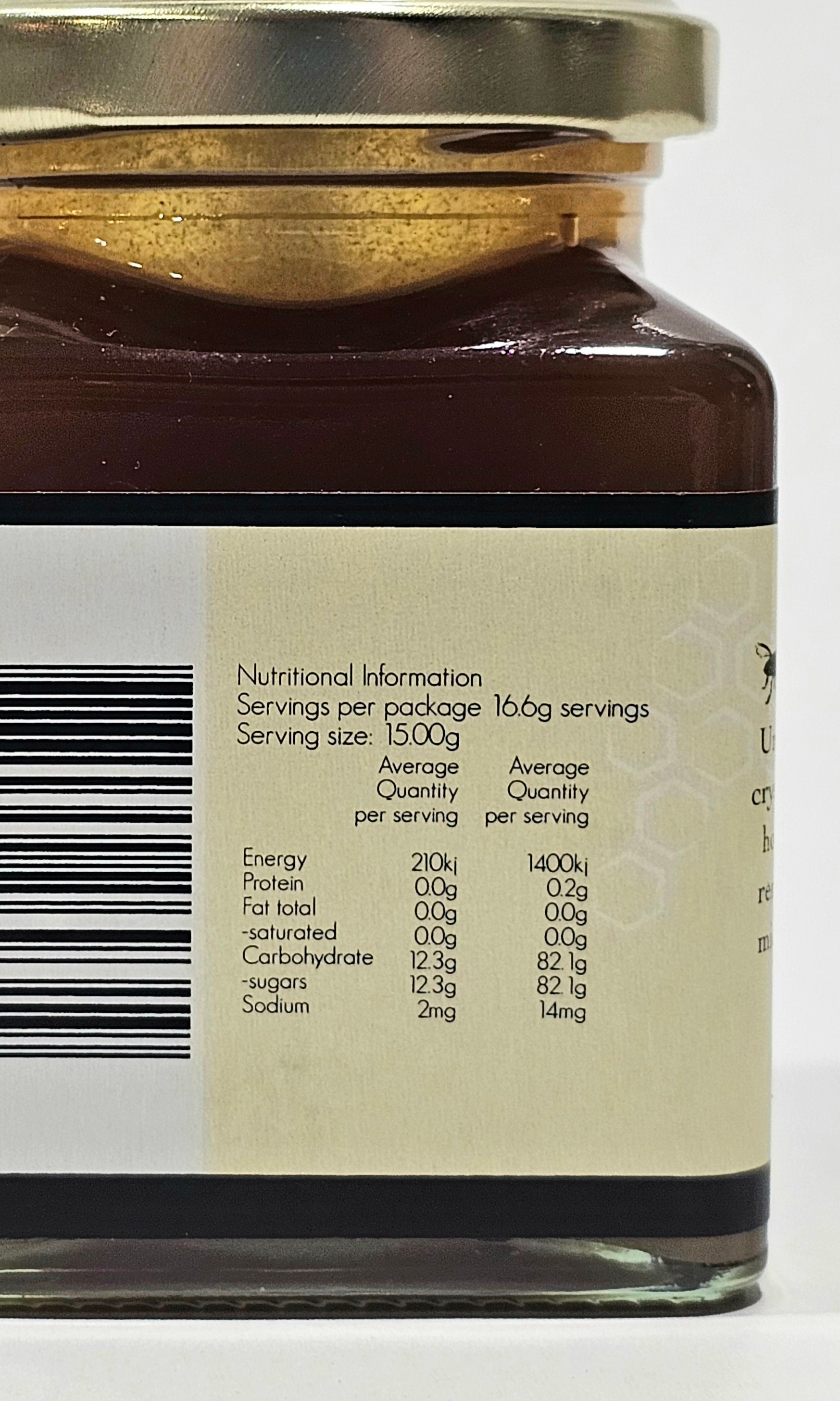 - 250 gram jar of raw, unprocessed Wedderburn Honey